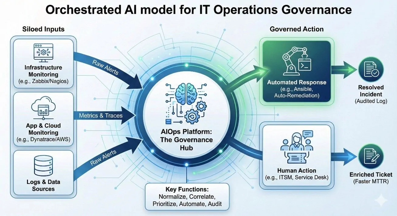 Por quê? Porque a fragmentação gera cegueira. Quando seus dados estão espalhados em silos, garantir SLAs, compliance e eficiência torna-se um jogo de adivinhação. Tentar monitorar isso manualmente não é apenas difícil; tornou-se humanamente impossível. A boa notícia? A tecnologia evoluiu para resolver exatamente este problema através da IA Orquestrada.